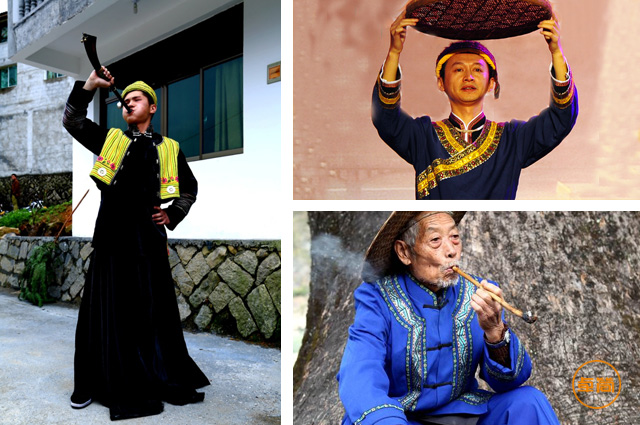男子畲族服饰分为两种,一种是平常穿的大襟无领青色麻布短衫;另一种是结婚或祭祖时穿的礼服,红顶黑缎官帽,青色或红色长衫,外套龙凤马褂,长衫的襟口和胸前有一方绣有龙的花纹图案,脚案白色布袜,圆口黑面布底鞋。