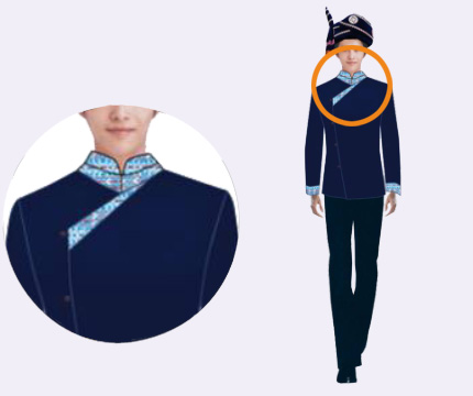 领型采用立领镶边设计,配以广西壮族花纹装饰,赋予民族文化内涵.