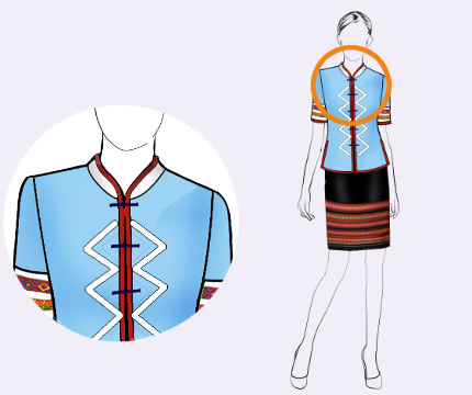 领型采用无领镶边设计,配以海南黎族花纹装饰,赋予民族文化内涵.